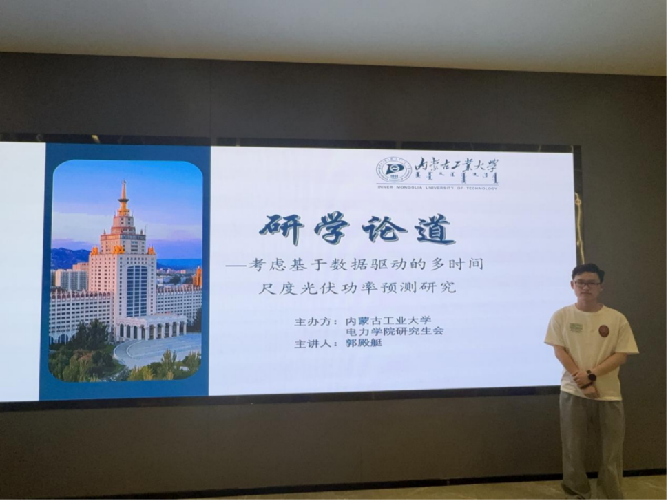 在科研的征途上,每一次分享都是知识的汇聚和智慧的碰撞。4月10日晚,电力学院研究生会成功举办本学期第二次“研学论道——研学术话题,论科研之道”学术分享会。本次活动由郭殿艇同学担任主讲人,他以《考虑基于数据驱动的多时间尺度光伏功率预测研究》为主题,系统展示光伏发电预测领域的前沿技术与创新成果。