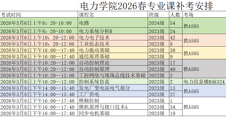 2026春电力学院专业课补考安排