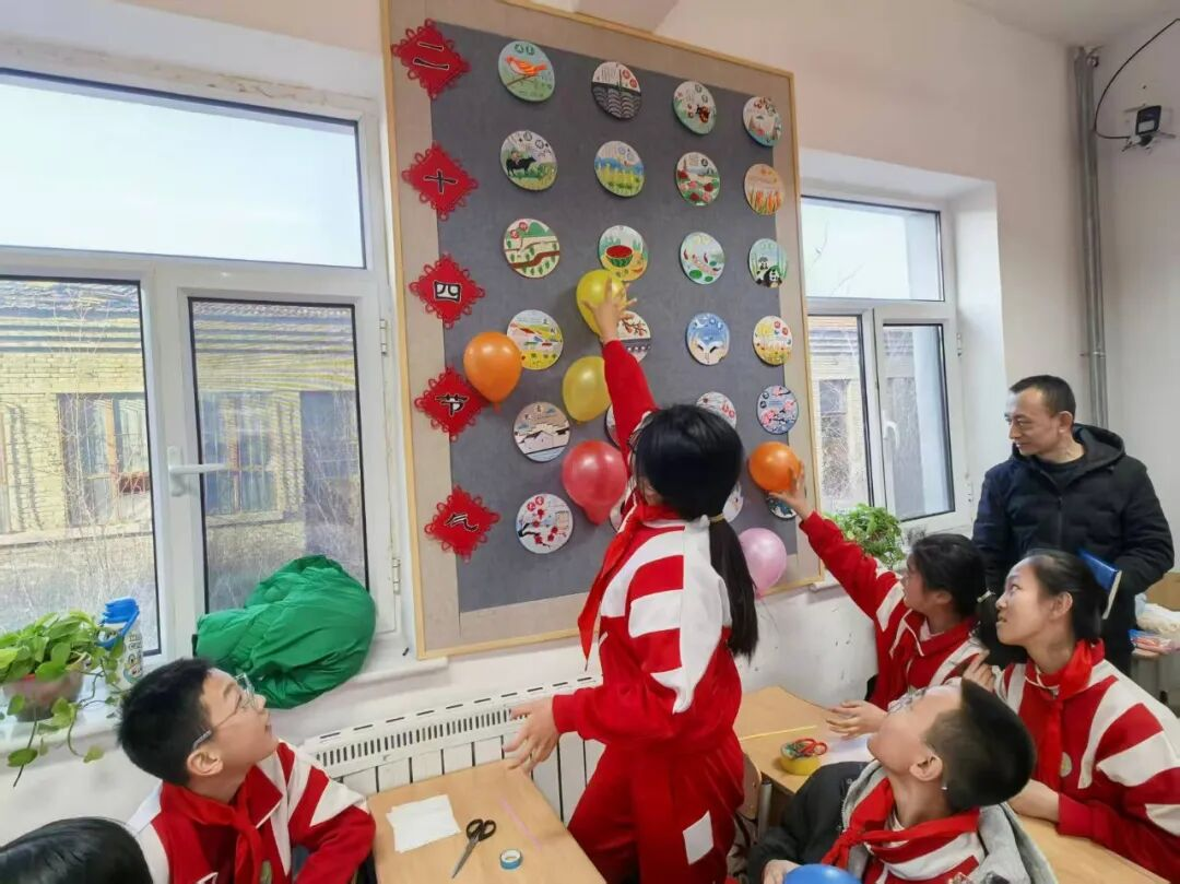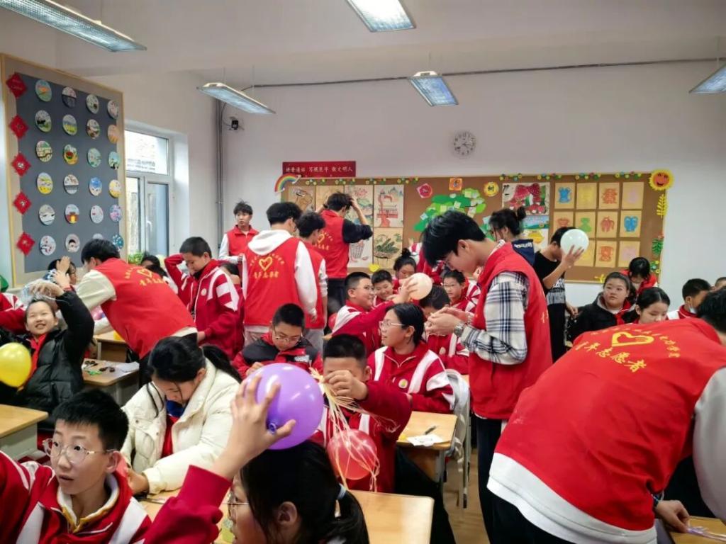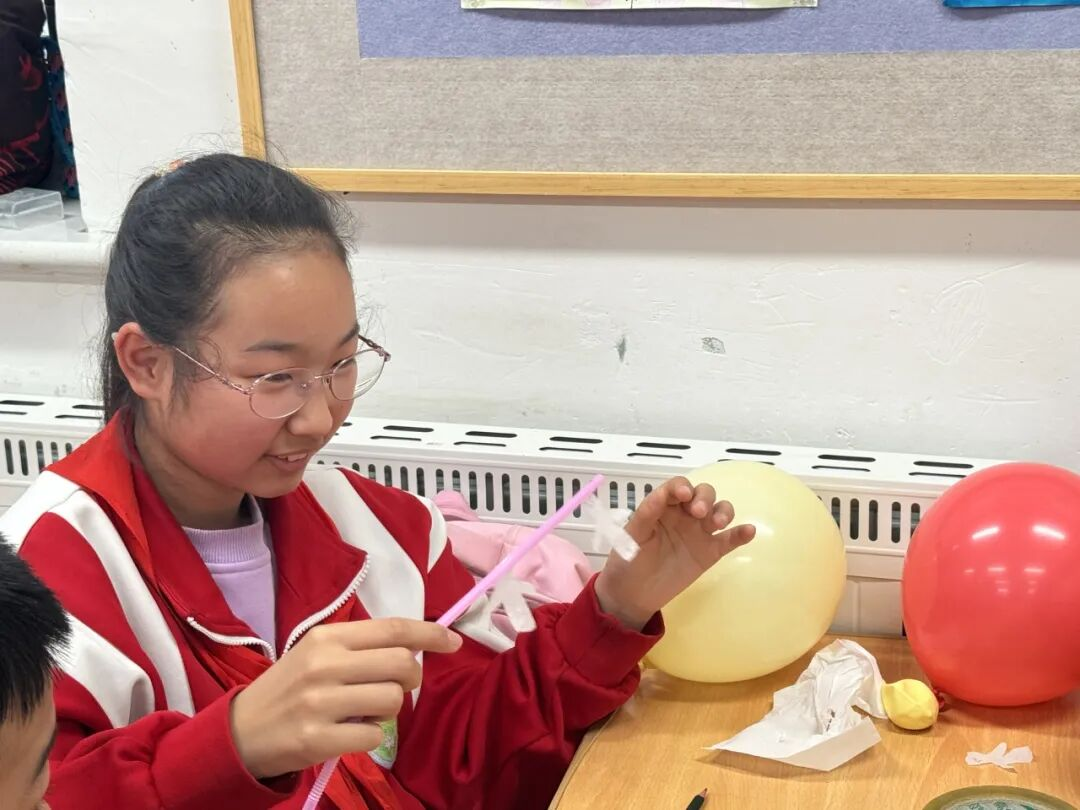 在“气球摩电·科学启智”实验环节,学生们按志愿者讲解步骤将气球在头发,外套上快速摩擦,观察到气球吸附墙面的趣味现象。