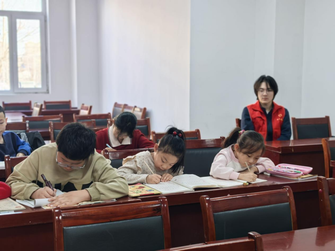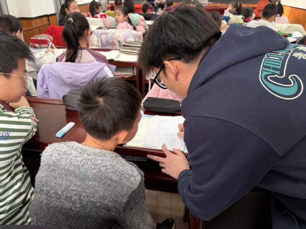 安嘉琦同学在社区志愿服务岗位上辅导小学生完成日常作业,纠正孩子的错误学习习惯,用实际行动展现了新时代青年的奉献与担当。