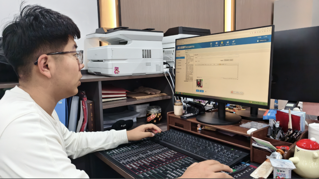 秦靖镔在社区岗位上,录入居民信息,让民生监督平台成为连接社区与居民的暖心数字桥梁,把服务精准送到群众身边。