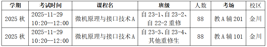 《微机原理与接口技术A》考试安排一览表